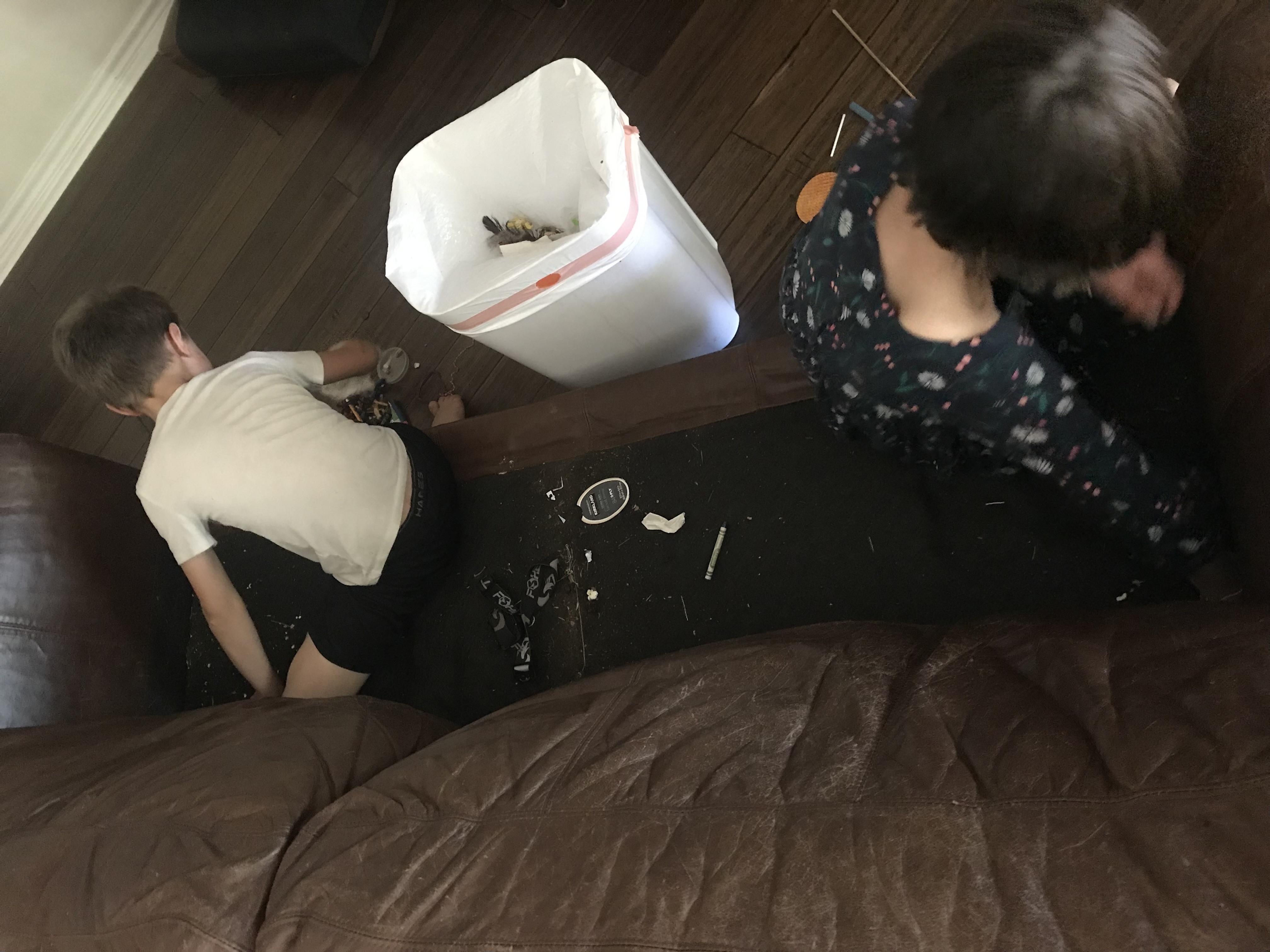 On Saturday I gave the kids gloves and set them couch fishing. We've had this couch for seven years and it was used when we got it. It always had mysterious rattling sounds when we moved it. |